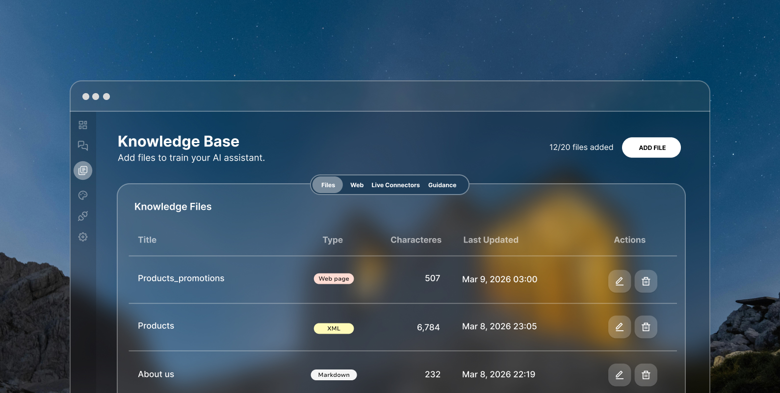 Upload documents, pages, or text. Decide exactly which live connector the assistant can read to answer questions.